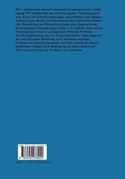 Wissenschaftliches Programm.- I. Schulterverletzungen.- II. Schienbeinkopforüche.- III. Freie Vorträge.- IV. Rettungsdienst und Katastrophenhilfe.- V. Sektion Berufskrankheiten.- VI. Sektion Berufskrankheiten (Dermatologie) Unfälle und Berufskrankheiten im Bereich der Dermatologie.- VIII. Sachverzeichnis.