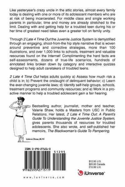 Like yesteryear's crazy uncle in the attic stories, almost every family today is dealing with one or more of its adolescent members who are at risk of being incarcerated. For middle class and single working parents in particular, time and money are already stretched to the limit. Dealing with and getting help for a troubled teen during his or her time of greatest need takes even a greater toll on family unity. Through 2 Late 4 Time Out the Juvenile Justice System is demystified through an engaging, shoot-from-the hip style narrative that is woven around preventive and corrective strategies, more than 100 illustrations, and over 1,000 links to schools, treatment and valuable resources found on the Internet! Complimenting the hard facts are self-assessments, dozens of true-life scenarios, hundreds of annotated links broken down by category and interactive quizzes designed to help adult caretakers of troubled teens. 2 Late 4 Time Out helps adults quickly a) Assess how much risk a child is in; b) Prevent the onslaught of delinquent behavior; c) Learn the ever-changing juvenile laws; d) Identify self-help groups, schools, treatment programs and community resources; and e) Work in a pro-active manner to help a troubled adolescent gain a fair hearing.