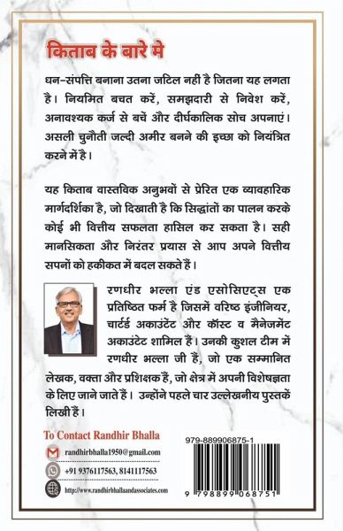 Kitaab ke baare mein Dhan-nirmaan utna jaṭil ya pahunch se baahar nahin hai jitna yah lag sakta hai - koi bhi, background ya experience ki parwaah kiye bina, ise praapt kar sakta hai. Mool siddhaant saral aur vishaal roop se samjhe jaane waale hain: lagataar bachat karein, soch-samajhkar nivesh karein, anavashyak karz se bachen, aur deerghaakaalik perspective banaayein rakhe. Asli chunauti in concepts mein nahin, balki tezi se dhan haasil karne ki chaahat mein hai. Yah pustak lekhak ki vyaktigat safalta ka jashn manane ke liye nahin likhi gayi hai; balki, yah lekhak ke anubhav se prerit ek vyaavaharik margdarshika hai. Vah maante hain ki anek anya logon ne bhi saman samay- seema ke bheetar ullekhniya vittiya uplabdhiyan haasil ki hain, kuchh ne to isse bhi adhik. Yahan prathmik uddeshya shikshit karna hai - yah spasht karna ki moolbhoot nivesh siddhaanton ka lagataar paalan karke, koi bhi aise vittiya parinaam praapt kar sakta hai jinka kayi log keval sapna dekhte hain. Is yatra ke maadhyam se, lekhak pathakon ko in rananeetiyon ko lagu karne ke liye sashakt banana chahte hain, jisse yah saabit ho sake ki seekhne aur kaam karne ke ichchhuk kisi bhi vyakti ke liye behtar nivesh prathayein pahunch mein hain. Pratibaddhta aur gyaan ke saath, pathak apni vittiya akaankshaaon ko vastavik safalta mein badal sakte hain.