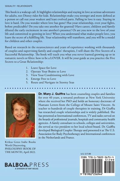 This book is a wakeup call. It highlights relationships and staying in love as serious adventures for adults, not Disney rides for kids. Relationships make you stronger and more defined as a person or call out your weakest and least evolved parts. Falling in love is easy. Staying in love is hard. Do you wonder where love has gone? Has your relationship, even your fights, before predictable? Do you take one another for granted? Have career, children and family diluted the early excitement in one another's presence? Or are you new to the love of your life and committed to growing in love? When you understand what makes people love, you learn the secret of a fulfilling life. Your relationship will transform, and you will be a model for children and other couples. Based on research in the neurosciences and years of experience working with thousands of couples and supervising family and couples' therapists, I will share the Five Secrets of a Successful Relationship. The book will teach you what you never learned growing up or in romantic novels or films: how to be a LOVER. It will be your guide as you practice the Five Secrets to a Great Relationship: 1. Leave Space for Love 2. Operate Your Brains to Love 3. View Your Conditioning with Love 4. Emerge Free to Love 5. Route and Navigate in Stormy Seas