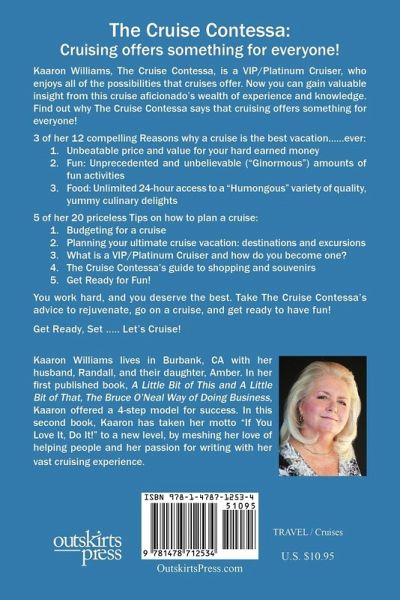 The Cruise Contessa: Cruising offers something for everyone! Kaaron Williams, The Cruise Contessa, is a VIP/Platinum Cruiser, who enjoys all of the possibilities that cruises offer. Now you can gain valuable insight from this cruise aficionado's wealth of experience and knowledge. Find out why The Cruise Contessa says that cruising offers something for everyone! 3 of her 12 compelling Reasons why a cruise is the best vacation......ever: Unbeatable price and value for your hard earned money; Fun: Unprecedented and unbelievable ("Ginormous") amounts of fun activities; Food: Unlimited 24-hour access to a "Humongous" variety of quality, yummy culinary delights. 5 of her 20 priceless Tips on how to plan a cruise: Budgeting for a cruise; Planning your ultimate cruise vacation: destinations and excursions; What is a VIP/Platinum Cruiser and how do you become one? The Cruise Contessa's guide to shopping and souvenirs. Get Ready for Fun! You work hard, and you deserve the best. Take The Cruise Contessa's advice to rejuvenate, go on a cruise, and get ready to have fun! Get Ready, Set ..... Let's Cruise!