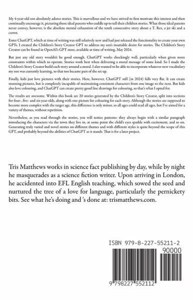 My 4-year-old son absolutely adores stories. This is marvellous and we have strived to first motivate this interest and then continually encourage it, picturing those ideal parents who cuddle up to tell their children stories. What those ideal parents never convey, however, is the absolute mental exhaustion of the tenth consecutive story about a T. Rex, a jet ski and a carrot. Enter ChatGPT, which at time of writing was still relatively new and had just released the functionality to create your own GPTs. I created the Children's Story Creator GPT to address my son's insatiable desire for stories. The Children's Story Creator can be found in OpenAI's GPT store, available at time of writing, May 2024. But just any old story wouldn't be good enough. ChatGPT works shockingly well, particularly when given more constraints within which to operate. Stories work best when delivering a moral message of some kind. So I made the Children's Story Creator build each story around a moral. I also wanted to be able to incorporate whatever new vocabulary my son was currently learning, so that too became part of the set up. Finally, kids just love pictures with their stories. Here, however, ChatGPT still (in 2024) falls very flat. It can create stunning pictures, but is completely incapable of maintaining consistent characters from one image to the next. But kids also love colouring, and ChatGPT can create pretty good line drawings for colouring, so that's what I opted for. The results are awesome. Within this book are 20 stories generated by the Children's Story Creator, split into sections for four-, five- and six-year-olds, along with one picture for colouring for each story. Although the stories are supposed to become more complex with the target age, this difference is only minor, so all ages could read all ages, but I've aimed for a variety of themes, without repetition. Nevertheless, as you read through the stories, you will notice patterns: they always begin with a similar paragraph introducing the characters via the town they live in, at some point the child's eyes sparkle with excitement, and so on. Generating truly varied and novel stories on different themes and with different styles is quite beyond the scope of this GPT, and probably beyond the abilities of ChatGPT as it stands. That is for a later project.