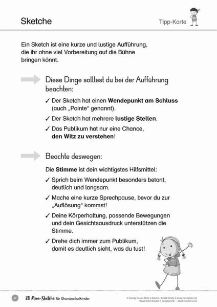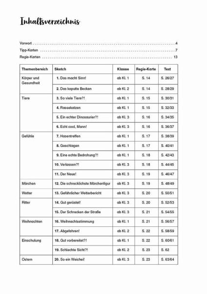 Kopiervorlagen für Kinder an Grundschulen, Förderschulen, Fach Deutsch, Klasse 1-4 +++ Vorhang auf und Bühne frei für alle Nachwuchs-Comedians!Diese 20 Sketche für die Grundschule, vom Anspruchsniveau auf die Schulstufen 1/2 und 3/4 abgestimmt, machen kleine Aufführungen zum Kinderspiel.Unser Motto: Einfach lachen und sich amüsieren! Denn mit passenden Tipp- und Regiekarten zu den kurzen Sketchen haben die Kinder den perfekt inszenierten Auftritt. Garantiert ohne aufwändige Bühnenbilder und Requisiten - aber mit Platz für Improvisationen!Mit Wort- und Handlungswitz können Sie typische schulische Anlässe, wie Einschulung oder Abschiedsfeier, köstlich witzig verpacken. Die kleinen Theaterstücke zu den sachunterrichtlichen und jahreszeitlichen Themen, wie z. B. "Wetter", "Tiere", "Ritter" oder "Weihnachten", sorgen für eine gelungene Abwechslung während Ihres Unterrichts.Bei den Sketchen für die Klasse 1/2 leiten Sie die Kinder mithilfe wichtiger Umsetzungstipps an. Zudem sind hier die Schriftgröße und die Textmenge auf die jungen Leser und Leser_innen abgestimmt. Die Materialien für die Klasse 3/4 ermöglichen es den Kindern, die kurzweiligen Szenen nach und nach selbstständig umzusetzen.