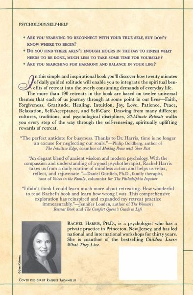 This collection of step-by-step practices from ancient cultures, world religions, and psychological disciplines provides readers with the self-renewing, spiritually, uplifting rewards of retreat anytime, anywhere. We all crave periods of silence and introspection, but with lives lived at an ever-increasing pace most of us find fewer opportunities to fill that need. Now, psychologist Rachel Harris has come to the rescue with this unique collection of 20-, 5- and 1-minute mini-retreats-short periods of meditation, contemplation or self-discovery drawn from traditions and practices as varied as Buddhism, the Quaker faith, Sufism, art therapy, ritual magic, Gestalt therapy, and Jungian dream analysis. Provocative sidebars, stimulating quotes, and touching first-person stories make this book as inviting to read as it is practical to use. With these brief retreats, readers of any age or occupation will be able to catch their emotional breath regardless of what is happening in life, to pause to listen to the sounds of their souls, and to reemerge balanced and refreshed.