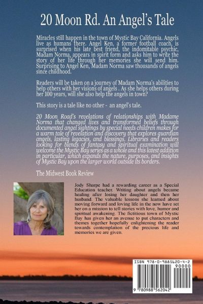 From Jody Sharpe, Award Winning, Bestselling Author 1st Place Winner of the 2023 National Association of Press Women's Communications Contest Award for Fiction For Adult Readers - Novellas The Bully Never Wins. Miracles still happen in the town of Mystic Bay California. Angels live as humans there. Angel Ken, a former football coach, is surprised when his late best friend, the indomitable psychic, Madam Norma, appears in spirit form and asks him to write the story of her life through her memories she will send him. Surprising to Angel Ken, Madam Norma saw thousands of angels since childhood. Readers will be taken on a journey of Madam Norma's abilities to help others with her visions of angels . As she helps others during her 100 years, will she also help the angels in town? This story is a tale like no other, an angel's tale. "From angelic community programs and interpersonal relationships to the history of a town that embodies God's promises and reflects a prosperity that comes from spiritual connections, Sharpe creates a compelling story powered by a writer's reflections of his town's characters and world and Madame Norma's thoughtful, ongoing influences on those who reside there. Do angels come to children with special needs? In Mystic Bay, they do. As the truth emerges about the town's makeup, history, and mission, readers become immersed in a spiritual story of angels and beliefs that drive positive changes and kindness in the world and spread beyond the small town of angels: "The world now knows of the children's sightings. It's given believers more hope. It certainly has given all of us in our small town hope and more heart. We are trying to do the work of angels by helping others, volunteering, fostering and adopting children and taking care to rescue animals in need." Sharpe's Mystic Bay series embodies hope, belief, the power of conviction and angel influences, and the acts of kindness that lead humanity on a better, gentler path. 20 Moon Road's revelations of relationships with Madame Norma that changed lives and transformed beliefs through documented angel sightings by special needs children makes for a warm tale of revelation and discovery that explores guardian angels, lasting legacies, and blessings. Libraries and readers looking for blends of fantasy and spiritual examination will welcome the Mystic Bay series as a whole and this latest addition in particular, which expands the nature, purposes, and insights of Mystic Bay upon the larger world outside its borders." D. Donovan, Senior Reviewer, Midwest Book Review