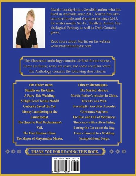This illustrated anthology contains 20 flash fiction stories. Some are funny, some are scary, and some are plain weird. The Anthology contains the following stories. 100 Tinder Dates. Murder on The Ghan. A Fairy-Tale Wedding. A High-Level Tennis Match! Curiosity Saved the Cat. Money Laundering in the Laundromat. The Quest to Find Pachamama's Veil. The First Human Clone. The Mayor of Mayonnaise Manor. Library Shenanigans. The Masked Menace Martin Puther's mission in China. Eternity Can Wait. Serendipity Saved the Arsonist. Christmas Mayhem The Rise and Fall of Melchriess. Theocracy with a silver-lining. Letting the Cat out of the Bag From a Funeral to a Wedding.