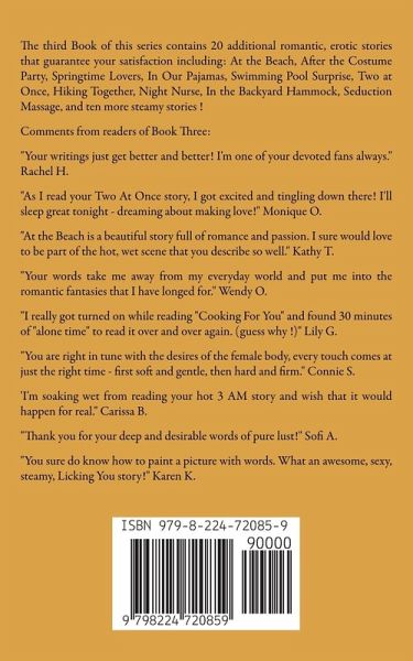 The third Book of this series contains 20 additional romantic, erotic stories that guarantee your satisfaction including: At the Beach, After the Costume Party, Springtime Lovers, In Our Pajamas, Swimming Pool Surprise, Two at Once, Hiking Together, Night Nurse, In the Backyard Hammock, Seduction Massage, and ten more steamy stories ! Comments from readers of Book Three: "Your writings just get better and better! I'm one of your devoted fans always." Rachel H. "As I read your Two At Once story, I got excited and tingling down there! I'll sleep great tonight - dreaming about making love!" Monique O. "At the Beach is a beautiful story full of romance and passion. I sure would love to be part of the hot, wet scene that you describe so well." Kathy T. "Your writings come alive in my mind." Samantha H. "Your words take me away from my everyday world and put me into the romantic fantasies that I have longed for." Wendy O. I" love your sexy stories! They make me very aroused and I have to pleasure myself while reading them!" Donna F. "I really got turned on while reading "Cooking For You" and found 30 minutes of "alone time" to read it over and over again. (guess why !)" Lily G. "You are right in tune with the desires of the female body, every touch comes at just the right time - first soft and gentle, then hard and firm." Connie S. 'I'm soaking wet from reading your hot 3 AM story and wish that it would happen for real...." Carissa B. "Thank you for your deep and desirable words of pure lust!" Sofi A. "You sure do know how to paint a picture with words. What an awesome, sexy, steamy, Licking You story!" Karen K.