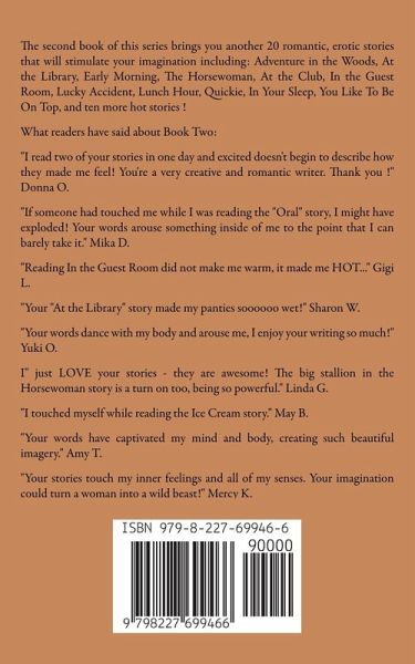 The second book of this series brings you another 20 romantic, erotic stories that will stimulate your imagination including: Adventure in the Woods, At the Library, Early Morning, The Horsewoman, At the Club, In the Guest Room, Lucky Accident, Lunch Hour, Quickie, In Your Sleep, You Like To Be On Top, and ten more hot stories ! What readers have said about Book Two: "I read two of your stories in one day and excited doesn't begin to describe how they made me feel! You're a very creative and romantic writer. Thank you !" Donna O. "If someone had touched me while I was reading the "Oral" story, I might have exploded! Your words arouse something inside of me to the point that I can barely take it." Mika D. "Your sexy stories always give me SO much pleasure!!!" Lucy P. "Reading In the Guest Room did not make me warm, it made me HOT..." Gigi L. "Your "At the Library" story made my panties soooooo wet!" Sharon W. "Your words dance with my body and arouse me, I enjoy your writing so much!" Yuki O. I" just LOVE your stories - they are awesome! The big stallion in the Horsewoman story is a turn on too, being so powerful." Linda G. "I touched myself while reading the Ice Cream story." May B. "Your words have captivated my mind and body, creating such beautiful imagery." Amy T. "Your stories touch my inner feelings and all of my senses. Your imagination could turn a woman into a wild beast!" Mercy K. This book is also available in paperback.