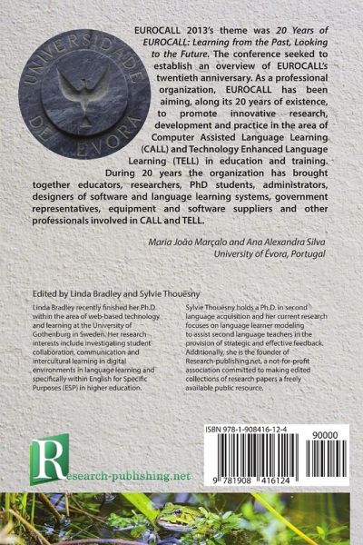 EUROCALL 2013's theme was 20 Years of EUROCALL: Learning from the Past, Looking to the Future. The conference seeked to establish an overview of EUROCALL's twentieth anniversary. As a professional organization, EUROCALL has been aiming, along its 20 years of existence, to promote innovative research, development and practice in the area of Computer Assisted Language Learning (CALL) and Technology Enhanced Language Learning (TELL) in education and training. During 20 years the organization has brought together educators, researchers, PhD students, administrators, designers of software and language learning systems, government representatives, equipment and software suppliers and other professionals involved in CALL and TELL.