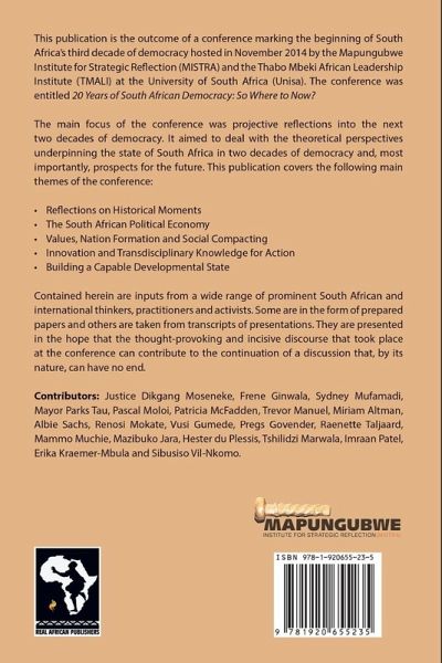 This publication is the outcome of a conference marking the beginning of South Africa’s third decade of democracy hosted in November 2014 by the Mapungubwe Institute for Strategic Reflection (MISTRA) and the Thabo Mbeki African Leadership Institute (TMALI) at the University of South Africa (Unisa). The conference was entitled 20 Years of South African Democracy: So Where to Now? The main focus of the conference was projective reflections into the next two decades of democracy. It aimed to deal with the theoretical perspectives underpinning the state of South Africa in two decades of democracy and, most importantly, prospects for the future. This publication covers the following main themes of the conference: Reflections on Historical Moments The South African Political Economy Values, Nation Formation and Social Compacting Innovation and Transdisciplinary Knowledge for Action Building a Capable Developmental State Contained herein are inputs from a wide range of prominent South African and international thinkers, practitioners and activists. Some are in the form of prepared papers and others are taken from transcripts of presentations. They are presented in the hope that the thought-provoking and incisive discourse that took place at the conference can contribute to the continuation of a discussion that, by its nature, can have no end. Contributors: Justice Dikgang Moseneke, Frene Ginwala, Sydney Mufamadi, Mayor Parks Tau, Pascal Moloi, Patricia McFadden, Trevor Manuel, Miriam Altman, Albie Sachs, Renosi Mokate, Vusi Gumede, Pregs Govender, Raenette Taljaard, Mammo Muchie, Mazibuko Jara, Hester du Plessis, Tshilidzi Marwala, Imraan Patel, Erika Kraemer-Mbula and Sibusiso Vil-Nkomo.
