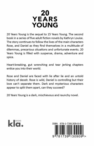 20 Years Young is the sequel to 15 Years Young. The second book in a series of five adult fiction novels by Kathryn Louise. The story continues to follow the lives of the main characters Rose, and Daniel as they find themselves in a multitude of dilemmas, precarious situations and unfortunate events. 20 Years Young is filled with suspense, drama, adventure and spice. Heart-breaking, gut wrenching and tear jerking chapters entice you into their world. Rose and Daniel are faced with lie after lie and an untold history of deceit. Rose is wild, Daniel is controlling but their love can't separate them. Dark and mysterious characters appear to split them apart, can they succeed? 20 Years Young is a dark, mischievous and raunchy novel.