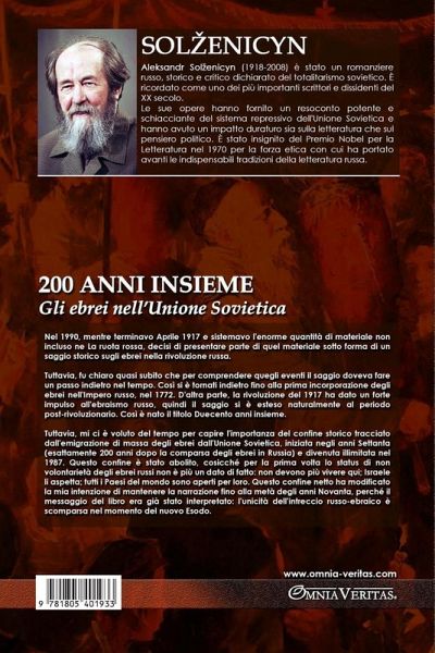 Nel 1990, mentre terminavo Aprile 1917 e sistemavo l'enorme quantità di materiale non incluso ne La ruota rossa, decisi di presentare parte di quel materiale sotto forma di un saggio storico sugli ebrei nella rivoluzione russa. Tuttavia, fu chiaro quasi subito che per comprendere quegli eventi il saggio doveva fare un passo indietro nel tempo. Così si è tornati indietro fino alla prima incorporazione degli ebrei nell'Impero russo, nel 1772. D'altra parte, la rivoluzione del 1917 ha dato un forte impulso all'ebraismo russo, quindi il saggio si è esteso naturalmente al periodo post-rivoluzionario. Così è nato il titolo Duecento anni insieme. Tuttavia, mi ci è voluto del tempo per capire l'importanza del confine storico tracciato dall'emigrazione di massa degli ebrei dall'Unione Sovietica, iniziata negli anni Settanta (esattamente 200 anni dopo la comparsa degli ebrei in Russia) e divenuta illimitata nel 1987. Questo confine è stato abolito, cosicché per la prima volta lo status di non volontarietà degli ebrei russi non è più un dato di fatto: non devono più vivere qui; Israele li aspetta; tutti i Paesi del mondo sono aperti per loro. Questo confine netto ha cambiato la mia intenzione di mantenere la narrazione fino alla metà degli anni Novanta, perché il messaggio del libro era già stato interpretato: l'unicità dell'intreccio russo-ebraico è scomparsa al momento del nuovo Esodo. Ora inizia un periodo totalmente nuovo nella storia dell'ebraismo russo, ormai libero, e delle sue relazioni con la nuova Russia. Questo periodo è iniziato con cambiamenti rapidi ed essenziali, ma è ancora troppo presto per prevederne gli esiti a lungo termine e giudicare se il suo carattere peculiare russo-ebraico persisterà o sarà soppiantato dalle leggi universali della diaspora ebraica. Seguire l'evoluzione di questo nuovo sviluppo va oltre le possibilità di questo autore.