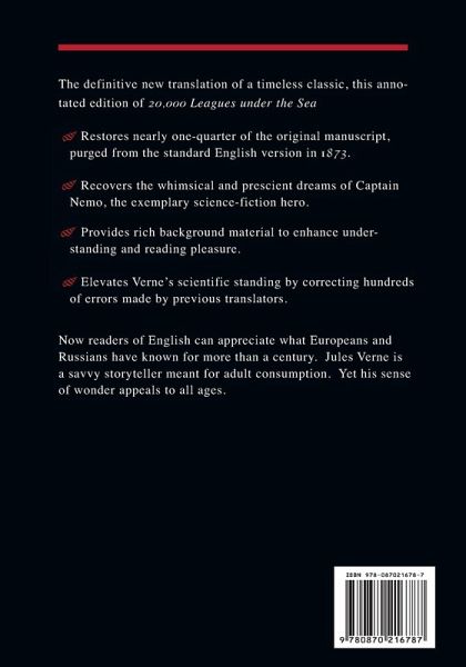 For the past 120 years, readers of English have known only a poor imitation of Jules Verne's classic French novel Vingt Mille Lieues Sous les Mers and consequently relegated the writer to the category of a "boy's author". Since 1873 the standard English version has been Lewis Mercier's mangled "translation," a work that's filled with errors, mistranslations, and bogus additions, and missing nearly a quarter of Verne's original text. Now, thanks to the life-long efforts of two Verne scholars, the English-speaking world at last has access to a definitive translation, the only English version based solely on the level of literary artist and scientific visionary, a category he has always enjoyed in Europe and Russia. Mercier's act of literary vandalism went unnoticed until 1965, when New York University English professor Walter Miller discovered the missing text and began the restoration of the Verne masterpiece. After nearly thirty years of work, including rigorous examinations of his translation by experts in marine technology and biology, Miller teamed that Frederick Paul Walter in 1992 to create this landmark scientific and literary achievement. Restored to the volume along with the original woodcut illustrations are the entertaining and often prescient drams of Captain Nemo, widely considered the prototypical science-fiction character. In this novel alone Verne has anticipated submarine diving planes, scuba gear, underwater laboratories, and marine ecological disasters. He also inspired large-scale underwater mining and farming of flora and fauna, and electricity from thermoclines, all currently in development. Restoration of these visionary ideas and some twenty-three percent of the original text is certain to elevate Verne's standing in American scientific and literary circles.