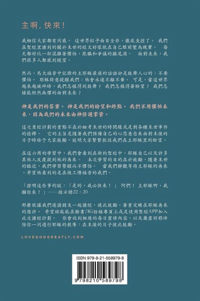我相信大家都有同感。 這世界似乎面目全非,徹底失控了。 我們在聖經里讀到的關於末世的經文好像就在自己眼前變為現實。 每天都好比一杯混雜著懼怕,欺騙和爭議的雞尾酒。 面對未來,我們很多人都感到絕望。 然而,馬太福音中記錄的主耶穌最後的話語卻是鼓舞人心的:不要懼怕。 耶穌特意提醒我們:他會永遠不離不棄。 可是,當這世界越來越破碎時,我們怎樣得到鼓舞? 我們怎樣得著盼望? 我們怎樣能坦然無懼的面對未來? 神是我們的答案。 神是我們的盼望和終點。 我們不用懼怕未來,因為我們的未來由神保護掌管。 這次查經計劃的重點不在於細考末世的時間線或是對各種末世事件的詮釋。 它的主旨是隨著我們預備自己的心思意念來面對末後的日子時給予大家鼓勵,説明大家緊緊抓住我們在主耶穌里的盼望。 在這六周的學習中,我們會看到在新約聖經中,耶穌自己以及許多其他人反覆提到他的再來。 本次學習的目的在於鼓勵,隨著末世的臨近,我們學習警醒而不懼怕。 當我們靜觀等待主耶穌的再來,希望他看到的是在做工傳福音的我們。 「證明這些事的說:「是的,我必快來! 」 阿們! 主耶穌啊,我願你來! 」--啟示錄22:20 那麼就讓我們邀請朋友一起讀經,彼此鼓勵,著重定睛在耶穌再來的應許。 希望妳能能在臉書/IG粉絲專頁上或是使用聖經App加入此次讀經計劃。 你會收到相應的每日靈修內容,以及屬靈好夥伴陪你一同遵行耶穌的教導:在末後的日子彼此鼓勵。