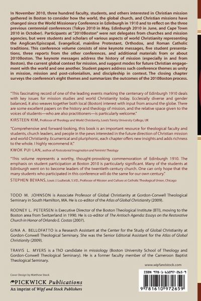 In November 2010, three hundred faculty, students, and others interested in Christian mission gathered in Boston to consider how the world, the global church, and Christian missions have changed since the World Missionary Conference in Edinburgh in 1910 and to reflect on the three previous centennial conferences (Tokyo 2010 in May, Edinburgh 2010 in June, and Cape Town 2010 in October). Participants at "2010Boston" were not delegates from churches and mission agencies, but were students and scholars of various aspects of world Christianity representing the Anglican/Episcopal, Evangelical, mainline Protestant, Orthodox, and Roman Catholic traditions. This conference volume consists of nine keynote messages, five student presentations, three reports from the other conferences, and additional materials from or about 2010Boston. The keynote messages address the history of mission (especially in and from Boston) and the current global context for mission, and suggest modes for future Christian engagement with the world and one another. Student papers address such conference themes as unity in mission, mission and postcolonialism, and discipleship in context. The closing chapter surveys the conference's eight themes and summarizes the outcomes of the 2010Boston process.