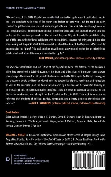 Chapter One: The 2012 Republican Nomination Season: A Clown Car or Feuding Conservatives?, William J. Miller Chapter Two: The Impact of Rules Changes on the 2012 Republican Presidential Primary Process, Joshua T. Putnam Chapter Three: White Knights to the Rescue! The Non-Candidates of 2012, William Cunion Chapter Four: The Curious Candidacy of Jon Huntsman, David F. Damore and Kenneth J. Retzl Chapter Five: Early to Rise, Early to Fall: The Short Lived Hope of Michele Bachmann, Jason Rich and Brandy A. Kennedy Chapter Six: The Hermanator: Anti-Elitism and the Rise of Herman Cain, Andrew L. Pieper Chapter Seven: Rick Perry: The Quickly Fading Star of Texas, Brian Arbour Chapter Eight: Newt Gingrich: It Takes More than Ideas to Win a Nomination, Joshua P. Stockley Chapter Nine: Ron Paul: Establishment Outsider or Radical Insider?, Jeremy D. Walling Chapter Ten: Of Sweater Vests and Broken Dreams: Santorum's Almost Win, Daniel J. Coffey and Terrence M. O'Sullivan Chapter Eleven: Mitt Romney-The Republican Choice, Sean D. Foreman Chapter Twelve: The Victor's Reward and the Future of the GOP, William J. Miller