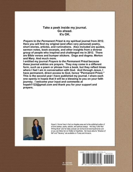 The spiritual journal of Christian writer Hope Horner includes original short stories, quotes, prayers, poems, and excerpts from Alistair Begg, Tim Keller, Anne Lamott, and Peter J. Gomes, just to name a few. Re-discover Moses, King David, Saint Peter, C.S. Lewis, Flannery O'Connor and Thomas Merton as you read the selections from Hope's personal journal. Visit www.hopehorner.com for more information about published author and musician Hope Horner.