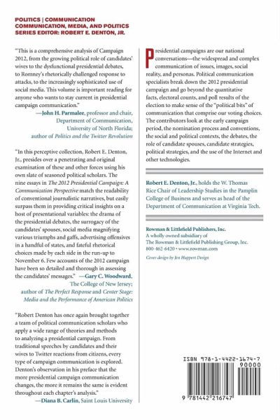 Preface Chapter 1: The Presidential Nominating Conventions and the American Dream: Narrative Unity and Political Division. Rachel Holloway Chapter 2: Change in the Communication Demands of Spouses in the 2012 Nominating Convention, Gwen Brown Chapter 3: Presidential Debates 2012, Ben Voth Chapter 4: "His to Lose": Strategic Keys to Challenging the Incumbent in 2012, Craig Allen Smith Chapter 5: Political Advertising in the 2012 U.S. Presidential Election, John C. Tedesco & Scott W. Dunn Chapter 6: "Death by Taxes": A Post-mortem on Romney's Tax Return Apologia, Joseph M. Valenzano III & Jason A. Edwards Chapter 7: Presidential Campaigns as Cultural Events: The Convergence of Politics and Popular Culture in Election 2012, Jeffrey P. Jones Chapter 8: The New Media Campaign of 2012, John Allen Hendricks Chapter 9: Explaining the Vote in the Election of 2008: Obama's Re-election, Henry C. Kenski & Kate M. Kenski Index About the Contributors