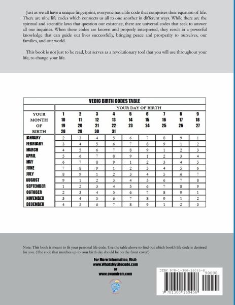 This book is for you if you were born on: Jan 02,11,20,29;Feb 01,10,19,28;Mar 09,18,27;Apr 08,17,26; May 07,16,25;Jun 06,15,24;Jul 05,14,23;Aug 04,13,22,31;Sep 03,12,21,30; Oct 02,11,20,29;Nov 01,10,19,28;Dec 09,18,27. Just as we all have a unique fingerprint, everyone has a Life Code that comprises his or her equation of life. Nine codes connect us to one another in different ways. While there are the spiritual and scientific laws that question our existence, there are universal codes that can answer our inquiries. When you know these codes, they result in powerful knowledge that can guide our lives to success, peace and prosperity.