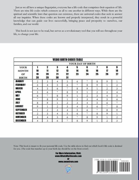 This book is for you if you were born on: Jan 05,14,23; Feb 04,13,22; Mar 03,12,21,30; Apr 02,11,20,29; May 01,10,19,28; Jun 09,18,27; Jul 08,17,26; Aug 07,16,25; Sep 06,15,24; Oct 05,14,23; Nov 04,13,22; Dec 03,12,21,30. Just as we all have a unique fingerprint, everyone has a Life Code that comprises his or her equation of life. Nine codes connect us to one another in different ways. While there are the spiritual and scientific laws that question our existence, there are universal codes that can answer our inquiries. When you know these codes, they result in powerful knowledge that can guide our lives to success, peace and prosperity.