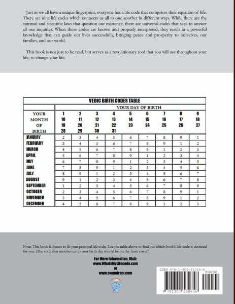 This book is for you if you were born on: Jan 08,17,26; Feb 07,16,25; Mar 06,15,24; Apr 05,14,23; May 04,13,22,31; Jun 03,12,21,30; Jul 02,11,20,29; Aug 01,10,19,28; Sep 09,18,27; Oct 08,17,26;Nov 07,16,25; Dec 06,15,24. Just as we all have a unique fingerprint, everyone has a Life Code that comprises his or her equation of life. Nine codes connect us to one another in different ways. While there are the spiritual and scientific laws that question our existence, there are universal codes that can answer our inquiries. When you know these codes, they result in powerful knowledge that can guide our lives to success, peace and prosperity.