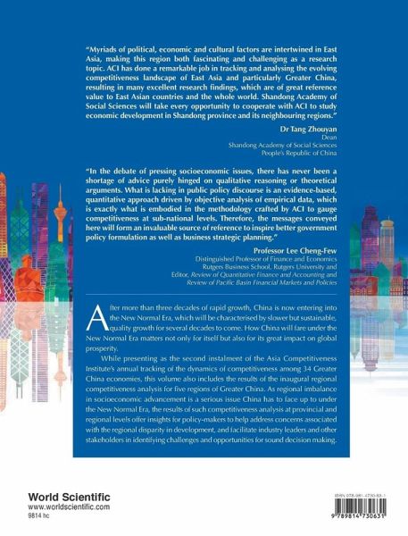After more than three decades of rapid growth, China is now entering into the New Normal Era, which will be characterised by slower but sustainable, quality growth for several decades to come. How China will fare under the New Normal Era matters not only for itself but also for its great impact on global prosperity.While presenting as the second instalment of ACI's annual tracking of the dynamics of competitiveness among 34 Greater China economies, this volume also includes the results of the inaugural regional competitiveness analysis for five regions of Greater China. As regional imbalance in socioeconomic advancement is a serious issue China has to face up to under the New Normal Era, the results of such competitiveness analysis at provincial and regional levels offer insights for policy-makers to help address concerns associated with the regional disparity in development, and facilitate industry leaders and other stakeholders in identifying challenges and opportunities for sound decision making.