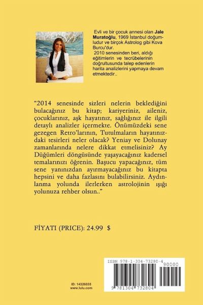 "2014 senesinde sizleri nelerin bekledigini bulacaginiz bu kitap; kariyeriniz, aileniz, cocuklariniz, ask hayatiniz, sagliginiz ile ilgili detayli analizler icermekte. Onumuzdeki sene gezegen Retro'larinin, Tutulmalarin hayatinizdaki tesirleri neler olacak? Yeniay ve Dolunay zamanlarinda nelere dikkat etmelisiniz? Ay Dugumleri dongusunde yasayacaginiz kadersel temalarinizi ogrenin. Basucu yapacaginiz, tum sene yaninizdan ayirmayacaginiz bu kitapta hepsini ve daha fazlasini bulabilirsiniz. Aydinlanma yolunda ilerlerken astrolojinin isigi yolunuza rehber olsun.." Astroloji; Evren'de var olan Gezegenlerin, Sabit Yildiz'larin uzerimizdeki etkilerini sifreler, teknikler, matematiksel formullerle cozen simge dilidir. Astrolog; bu simgeleri yorumlar. BU KITABI NASIL OKUMALISINIZ? Bu kitap gecmis donemlerde yasadiginiz olaylarin bir ozeti ile baslayarak 2014 senesindeki kariyer, ask hayatiniz, aileniz, cocuklariniz, sagliginiz, ic dunyaniz, yasam felsefeniz ile ilgili konularda detayli analizler icermekte.