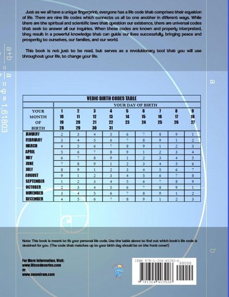 This book is for you if you were born on: Jan 05,14,23; Feb 04,13,22; Mar 03,12,21,30; Apr 02,11,20,29; May 01,10,19,28; Jun 09,18,27; Jul 08,17,26; Aug 07,16,25; Sep 06,15,24; Oct 05,14,23; Nov 04,13,22; Dec 03,12,21,30. Just as we all have a unique fingerprint, everyone has a Life Code that comprises his or her equation of life. Nine codes connect us to one another in different ways. While there are the spiritual and scientific laws that question our existence, there are universal codes that can answer our inquiries. When you know these codes, they result in powerful knowledge that can guide our lives to success, peace and prosperity.