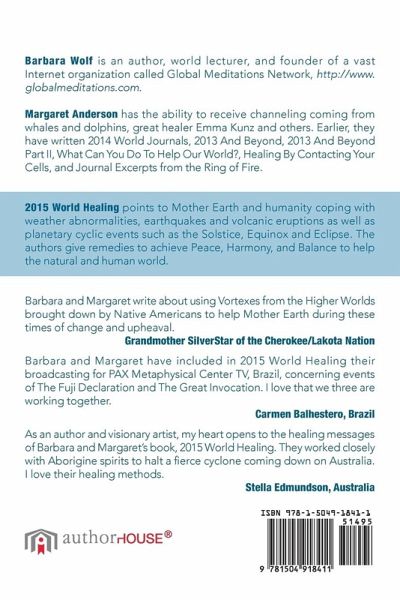 2015 World Healing points to Mother Earth and humanity coping with weather abnormalities, earthquakes and volcanic eruptions as well as planetary cyclic events such as the Solstice, Equinox and Eclipse. The authors give remedies to achieve Peace, Harmony, and Balance to help the natural and human world. Barbara and Margaret write about using Vortexes from the Higher Worlds brought down by Native Americans to help Mother Earth during these times of change and upheaval. Grandmother SilverStar of the Cherokee/Lakota Nation Barbara and Margaret have included in 2015 World Healing their broadcasting for PAX Metaphysical Center TV, Brazil, concerning events of The Fuji Declaration and The Great Invocation. I love that we three are working together. Carmen Balhestero, Brazil As an author and visionary artist, my heart opens to the healing messages of Barbara and Margaret's book, 2015 World Healing. They worked closely with Aborigine spirits to halt a fierce cyclone coming down on Australia. I love their healing methods. Stella Edmundson, Australia