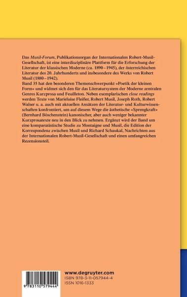 Das Musil-Forum, Publikationsorgan der Internationalen Robert-Musil-Gesellschaft, ist eine interdisziplinäre Plattform für die Erforschung der Literatur der klassischen Moderne und insbesondere des Werks von Robert Musil (1880-1942). Band 35 widmet sich unter dem Titel "Poetik der kleinen Form. Robert Musil und Zeitgenossen" den für das Literatursystem der Moderne zentralen Genres Kurzprosa und Feuilleton.