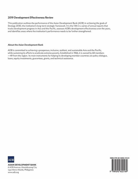The Development Effectiveness Review 2019 reports on ADB's progress in achieving the priorities of its corporate strategy using the indicators in the corporate results framework, 2019-2024 as the yardstick. This publication outlines the performance of the Asian Development Bank (ADB) in achieving the goals of Strategy 2030, the institution's long-term strategic framework. It is the 13th in a series of annual reports that tracks development progress in Asia and the Pacific, assesses ADB's development effectiveness over the years, and identifies areas where the institution's performance needs to be further strengthened.