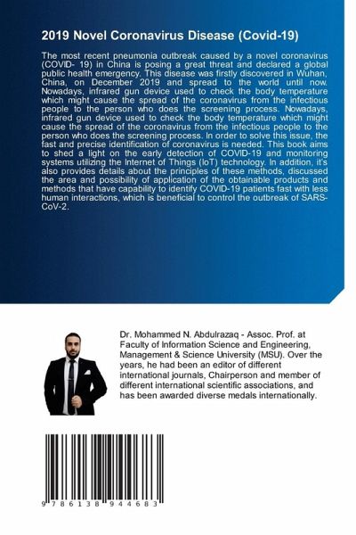 The most recent pneumonia outbreak caused by a novel coronavirus (COVID- 19) in China is posing a great threat and declared a global public health emergency. This disease was firstly discovered in Wuhan, China, on December 2019 and spread to the world until now. Nowadays, infrared gun device used to check the body temperature which might cause the spread of the coronavirus from the infectious people to the person who does the screening process. Nowadays, infrared gun device used to check the body temperature which might cause the spread of the coronavirus from the infectious people to the person who does the screening process. In order to solve this issue, the fast and precise identification of coronavirus is needed. This book aims to shed a light on the early detection of COVID-19 and monitoring systems utilizing the Internet of Things (IoT) technology. In addition, it's also provides details about the principles of these methods, discussed the area and possibility of application of the obtainable products and methods that have capability to identify COVID-19 patients fast with less human interactions, which is beneficial to control the outbreak of SARS-CoV-2.