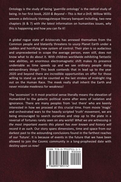 Written in 2015 and published in 2016 Willow Willis' first book, 2020 & Beyond - This is Not a Drill, will leave you speechless with the accuracy of her foresight's as 2020 and beyond unfolds. Updated with one incredible new chapter on what is about to occur for the human race, hang on to your hats as Earth is rocketed out of darkness and into the light in a turn around of events no one saw coming! A global rogue state of Aristocrats has annexed themselves from the Common people and blatantly threatens to usurp Planet Earth under a sudden and horrifying new system of control. Their plan is so audacious and unprecedented in scope the average person, even still, does not know what to do about it. With children worldwide exhibiting fantastic new abilities, an enormous electromagnetic shift makes its presence undeniable as time speeds up and we see ordinary people doing extraordinary things! This book contends that in lead up to the year 2020 and beyond there are incredible opportunities on offer for those willing to stand up and be counted as the last strokes of midnight ring out on the Human Race. The meek really shall inherit the Earth and never mistake meekness for weakness! The 'ascension' in it most practical sense literally means the elevation of Humankind to the galactic political scene after eons of isolation and ignorance! There are many peoples from 'out there' who are keenly interested in how we proceed at this crucial time. From movie 'magic' and orchestrated wars to the heavily scripted 'truth' movement, we are being encouraged to search ourselves and step up to the plate in a reversal of fortunes rarely seen on any world! What we are witnessing is the most important events this planet has ever known and history will record it as such. Our story spans dimensions, time and space from our darkest past to the astounding conclusions found in the farthest reaches of our 'future'. It is because of events in the future that we have been allowed to join the Cosmic community in a long-prophesied date with destiny upon us now!
