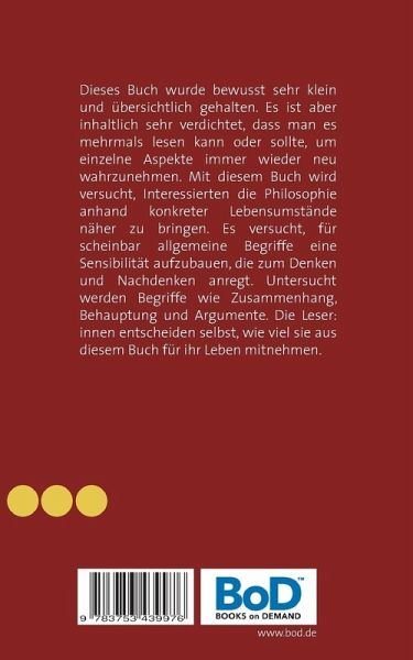 Dieses Buch wurde bewusst sehr klein und übersichtlich gehalten. Es ist aber inhaltlich sehr verdichtet, dass man es mehrmals lesen kann oder sollte, um einzelne Aspekte immer wieder neu wahrzunehmen. Mit diesem Buch wird versucht, Interessierten die Philosophie anhand konkreter Lebensumstände näher zu bringen. Es versucht, für scheinbar allgemeine Begriffe eine Sensibilität aufzubauen, die zum Denken und Nachdenken anregt. Untersucht werden Begriffe wie Zusammenhang, Behauptung und Argument. Die Leser:innen entscheiden selbst, wie viel sie aus diesem Buch für ihr Leben mitnehmen.