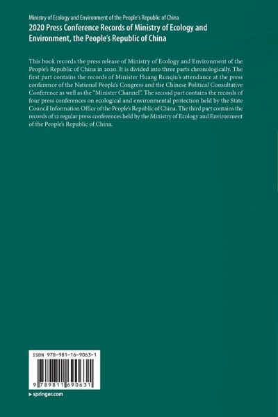 This book records the press release of Ministry of Ecology and Environment of the People's Republic of China in 2020. It is divided into three parts chronologically. The first part contains the records of Minister Huang Runqiu's attendance at the press conference of the National People's Congress and the Chinese Political Consultative Conference as well as the "Minister Channel". The second part contains the records of four press conferences on ecological and environmental protection held by the State Council Information Office of the People's Republic of China. The third part contains the records of 12 regular press conferences held by the Ministry of Ecology and Environment of the People's Republic of China.