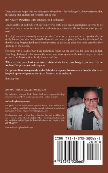 There are many people who are enthusiastic about food--the cooking of it, the preparation of it, the serving of it, and let's not forget the eating of it. But Andrew Delaplaine is the ultimate Food Enthusiast. This is another of his books with spot-on reviews of the most exciting restaurants in town. Some will merit only a line or two, just to bring them to your attention. Others deserve a half page or more. "Exciting" does not necessarily mean expensive. The area's top spots get the recognition they so richly deserve (and that they so loudly demand), but there are plenty of "sensible alternatives" for those looking for good food handsomely prepared by cooks and chefs who really care what they "plate up" in the kitchen. For those with a touch of Guy Fieri, Delaplaine ferrets out the best food for those on a budget. That dingy looking dive bar around the corner may serve up one of the juiciest burgers in town, perfect to wash down with a locally brewed craft beer. Whatever your predilection or taste, cuisine of choice or your budget, you may rely on Andrew Delaplaine not to disappoint. Delaplaine dines anonymously at the Publisher's expense. No restaurant listed in this series has paid a penny or given so much as a free meal to be included. Bon Appétit!