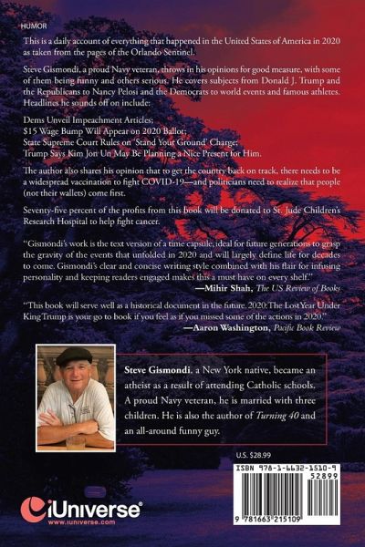 This is a daily account of everything that happened in the United States of America in 2020 as taken from the pages of the Orlando Sentinel. Steve Gismondi, a proud Navy veteran, throws in his opinions for good measure, with some of them being funny and others serious. He covers subjects from Donald J. Trump and the Republicans to Nancy Pelosi and the Democrats to world events and famous athletes. Headlines he sounds off on include: ¿ Dems Unveil Impeachment Articles; ¿ $15 Wage Bump Will Appear on 2020 Ballot; ¿ State Supreme Court Rules on 'Stand Your Ground' Charge; ¿ Trump Says Kim Jon Un May Be Planning a Nice Present for Him. The author also shares his opinion that to get the country back on track, there needs to be a widespread vaccination to fight COVID-19-and politicians need to realize that people (not their wallets) come first. Seventy-five percent of the profits from this book will be donated to St. Jude Children's Research Hospital to help fight cancer.