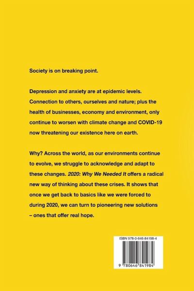 Society is on breaking point. Depression and anxiety are at epidemic levels. Connection to others, ourselves and nature; plus the health of businesses, economy and environment, only continue to worsen with climate change and COVID-19 now threatening our existence here on earth. Why? Across the world, as our environments continue to evolve, we struggle to acknowledge and adapt to these changes. 2020: Why We Needed It offers a radical new way of thinking about these crises. It shows that once we get back to basics like we were forced to during 2020, we can turn to pioneering new solutions - ones that offer real hope.