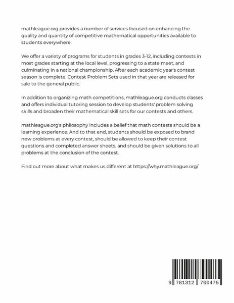 This book contains one year of mathleague.org Middle School Contest Problem Sets, complete with answer keys and solutions: 6 qualifying-level Contest Problem Sets, one State-level Contest Problem Set, and one National-level Contest Problem Set. Each Contest Problem Set contains a Sprint, Target, Team, and Countdown round.