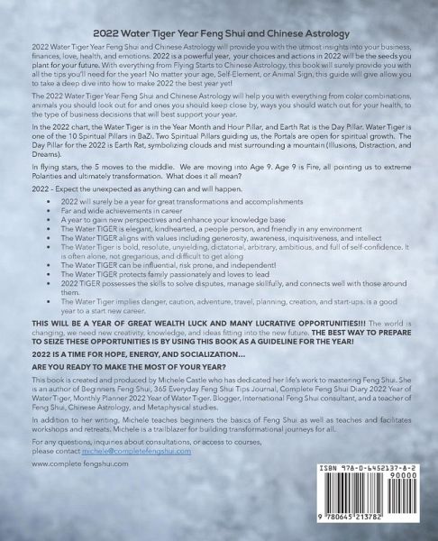 2022 Water Tiger Year: Feng Shui and Chinese Astrology will provide you with the utmost insights into your business, finances, love, health, and emotions. 2022 is a powerful year, your choices and actions in 2022 will be the seeds you plant for your future. With everything from Flying Starts to Chinese Astrology, this book will surely provide you with all the tips you'll need for the year! No matter your age, Self-Element, or Animal Sign, this guide will give allow you to take a deep dive into how to make 2022 the best year yet! The 2022 Water Tiger Year: Feng Shui and Chinese Astrology will help you with everything from colour combinations, animals you should look out for and ones you should keep close by, ways you should watch out for your health, to the type of business decisions that will best support your year. In flying stars, the 5 moves to the middle. We are moving into Age 9. Age 9 is Fire, all pointing us to extreme Polarities and ultimately transformation. What does it all mean? 2022 - Expect the unexpected as anything can and will happen. 2022 will surely be a year for great transformations and accomplishments Far and wide achievements in career A year to gain new perspectives and enhance your knowledge base The Water TIGER is elegant, kind-hearted, a people person, and friendly in any environment The Water TIGER aligns with values including generosity, awareness, inquisitiveness, and intellect The Water Tiger is bold, resolute, unyielding, dictatorial, arbitrary, ambitious, and full of self-confidence. It is often alone, not gregarious, and difficult to get along The Water TIGER can be influential, risk prone, and independent! The Water TIGER protects family passionately and loves to lead 2022 TIGER possesses the skills to solve disputes, manage skillfully, and connects well with those around them. The Water Tiger implies danger, caution, adventure, travel, planning, creation, and start-ups. is a good year to a start new career. THIS WILL BE A YEAR OF GREAT WEALTH LUCK AND MANY LUCRATIVE OPPORTUNITIES!!! The world is changing, we need new creativity, knowledge, and ideas fitting into the new future. THE BEST WAY TO PREPARE TO SEIZE THESE OPPORTUNITIES IS BY USING THIS BOOK AS A GUIDELINE FOR THE YEAR! 2022 IS A TIME FOR HOPE, ENERGY, AND SOCIALIZATION... ARE YOU READY TO MAKE THE MOST OF YOUR YEAR? This book is created and produced by Michele Castle who has dedicated her life's work to mastering Feng Shui. She is an author of Beginners Feng Shui, 365 Everyday Feng Shui Tips Journal, Complete Feng Shui Diary 2022 Year of Water Tiger, Monthly Planner 2022 Year of Water Tiger. Blogger, International Feng Shui consultant, and a teacher of Feng Shui, Chinese Astrology, and Metaphysical studies. In addition to her writing, Michele teaches beginners the basics of Feng Shui as well as teaches and facilitates workshops and retreats. Michele is a trailblazer for building transformational journeys for all.