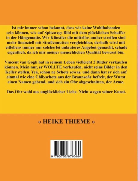 Ist mir immer schon bekannt, dass wir keine wohlhabenden sein können, wie auf Spitzwegs Bild mit dem glücklichen Schaffer in der Hängematte. Wir Künstler die mittellos umher streifen sind mehr finanziell mit Straßennutten vergleichbar, deshalb wird mit zeitlebens immer nur solcherlei unlauteres Angebot gemacht, schade eigentlich, da ich mir meiner menschlichen Qualität bewusst bin. Vincent van Gogh hat in seinem Leben vielleicht 2 Bilder verkaufen können. Mein nur, er WOLLTE verkaufen, nicht seine Bilder in den Keller stellen. Yeá, schon ne Schote sowas, und dann hat er sich auf einmal wie eine Chilyschote aus der Braunsoße befreit, der Wurst einen Namen gebend, und sich ein Ohr abgeschnitten, der Arme. Das Ohr wohl aus unglücklicher Liebe. Nicht wegen seiner Kunst.