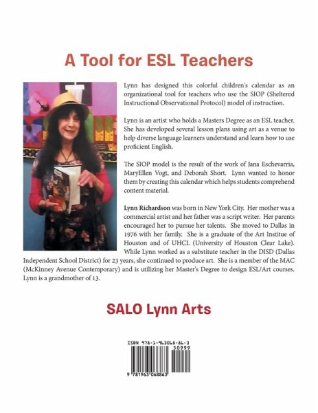 Lynn has designed this colorful children's calendar as an organizational tool for teachers who use the SIOP (Sheltered Instructional Observational Protocol) model of instruction. Lynn is an artist who holds a Masters Degree as an ESL teacher. She has developed several lesson plans using art as a venue to help diverse language learners understand and learn how to use proficient English. The SIOP model is the result of the work of Jana Eschevarria, MaryEllen Vogt, and Deborah Short. Lynn wanted to honor them by creating this calendar which helps students comprehend content material.