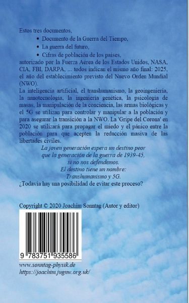 Estos tres documentos, Documento de la Guerra del Tiempo, La guerra del futuro, Cifras de población de los países, autorizado por la Fuerza Aérea de los Estados Unidos, NASA, CIA, FBI, DARPA, ... todos indican el mismo año final: 2025, el año del establecimiento previsto del Nuevo Orden Mundial (NWO). La inteligencia artificial, el transhumanismo, la geoingeniería, la nanotecnología, la ingeniería genética, la psicología de masas, la manipulación de la conciencia, las armas biológicas y el 5G se utilizan para controlar y manipular a la población y para asegurar la transición a la NWO. La…mehr