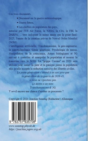 L'intelligence artificielle, Transhumanisme, la géo-ingénierie, la nanotechnologie, Génie génétique, Psychologie de masse, Manipulation de la conscience, Armes biologiques et 5G servant à contrôler et manipuler la population et assurer la transition vers le NOM. La "grippe Corona" en 2020 sera utilisée pour semer la peur et la panique parmi la population afin qu'elle accepte la réduction massive des libertés civiles.