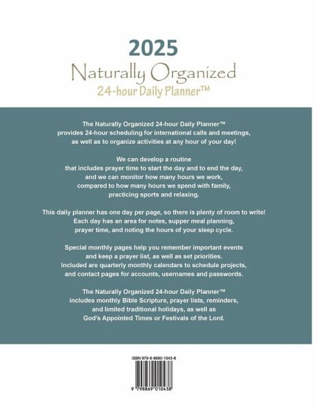 The 2025 Naturally Organized 24-hour Daily Planner¿ is a Christian Planner that can help you balance life, with work and home scheduling. If you start your day early, no problem! Included on each day is an area for prayer time at the beginning of the day and ending of the day. This planner allows you to schedule appointments and tasks 24 hours a day. If you make international calls, it is perfect! An area is reserved for supper planning. Sleep cycle notes can be made, as well. One page per day. In the beginning of the planner you will see quarterly planning areas for annual, quarterly, monthly and weekly goals. You can be naturally organized with your rhythm and planning that is perfect for you! The Feasts of the Lord or God's Divinely Appointed Times are also included from the Hebrew calendar: The Feast of Passover (Pesach) (Jesus' crucifixion); The Feast of Unleavened Bread (Hag HaMatzah) (Jesus' burial); The Feast of Firstfruits (Bikkurim) (Jesus' ressurection); The Feast of Weeks (Shavout) Pentecost (Holy Spirit outpouring); Feast of Trumpets (Rosh HaShanah) (Yom Teruah) (Rapture Gathering); The Day of Atonement (Yom Kippur) (Messiah Jesus' Second Coming); The Feast of Tabernacles (Sukkot) (Jesus' birth/Millennium); Feast of Dedication (Chanukah) (Jesus' conception - light of the world); Purim (man honoring God, remembering dangers, God's deliverance). You can be naturally organized!