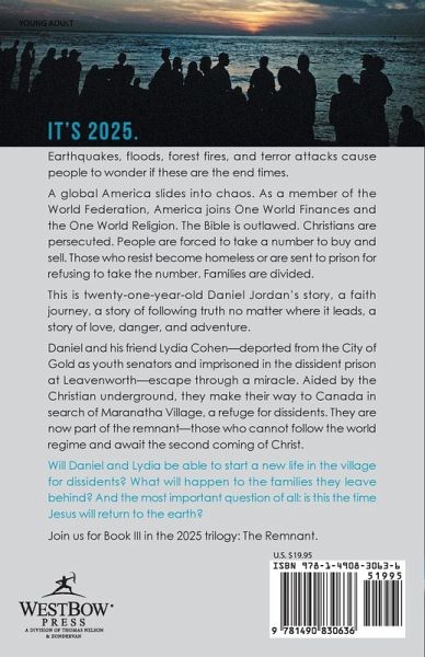 It's 2025. Earthquakes, floods, forest fires, and terror attacks cause people to wonder if these are the end times. A global America slides into chaos. As a member of the World Federation, America joins One World Finances and the One World Religion. The Bible is outlawed. Christians are persecuted. People are forced to take a number to buy and sell. Those who resist become homeless or are sent to prison for refusing to take the number. Families are divided. This is twenty-one-year-old Daniel Jordan's story, a faith journey, a story of following truth no matter where it leads, a story of love, danger, and adventure. Daniel and his friend Lydia Cohen-deported from the City of Gold as youth senators and imprisoned in the dissident prison at Leavenworth-escape through a miracle. Aided by the Christian underground, they make their way to Canada in search of Maranatha Village, a refuge for dissidents. They are now part of the remnant-those who cannot follow the world regime and await the second coming of Christ. Will Daniel and Lydia be able to start a new life in the village for dissidents? What will happen to the families they leave behind? And the most important question of all: is this the time Jesus will return to the earth? Join us for Book III in the 2025 trilogy: The Remnant.