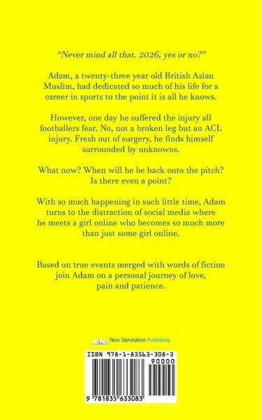 "Never mind all that. 2026, yes or no?" Adam, a twenty-three year old British Asian Muslim, had dedicated so much of his life for a career in sports to the point it is all he knows. However, one day he suffered the injury all footballers fear. No, not a broken leg but an ACL injury. Fresh out of surgery, he finds himself surrounded by unknowns. What now? When will he be back onto the pitch? Is there even a point? With so much happening in such little time, Adam turns to the distraction of social media where he meets a girl online who becomes so much more than just some girl online. Based on true events merged with words of fiction join Adam on a personal journey of love, pain and patience.