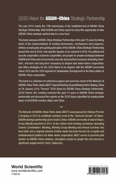 The year 2018 marks the 15th anniversary of the establishment of ASEAN-China Strategic Partnership. Both ASEAN and China expect to seize this opportunity to take ASEAN-China strategic partnership to a new level. This book assesses ASEAN-China Strategic Partnership in the past 15 years by taking stock of the implementation of existing ASEAN-China cooperation frameworks, mechanisms and programs; defines overall goals and guiding principles of the ASEAN-China Strategic Partnership toward the end of 2030; sets specific targets, to be reached in 2030, for political and security cooperation, economic cooperation, and people-to-people exchanges between ASEAN and China and recommends concrete and practical measures (including short-term, mid-term and long-term measures) to deepen and widen future cooperation; and offers strategies for the 2030 Vision to be aligned with the ASEAN Community Vision 2025 and the 2030 Agenda for Sustainable Development in the three pillars of ASEAN-China cooperation. This book is a collection of conference papers and summary report of the Network of ASEAN-China Think-tanks (NACT) Special Working Group Meeting held in Beijing, China on 26 January 2018. Themed "2030 Vision for ASEAN-China Strategic Partnership" (2030 Vision), the meeting reviewed the past 15 years of ASEAN-China strategic partnership and discussed the reports on the 2030 Vision submitted by leading think tanks of all ASEAN member states and China. The Network of ASEAN-China Think-tanks (NACT) was proposed by Chinese Premier Li Keqiang in 2013 to contribute scholarly work to the "diamond decade" of China-ASEAN strategic partnership and to build a China-ASEAN community of shared future. It was officially launched in 2014. So far, a three-level working mechanism (including Country Coordinators' Meeting, Working Group Meeting and Annual Seminar) has been built, and a regional network of think-tanks has been formed. As a regular and institutionalized platform for think-tanks cooperation, NACT serves to promote joint studies on ASEAN-China relations, strengthen people-to-people ties and become a significant supplement to Track I diplomacy.