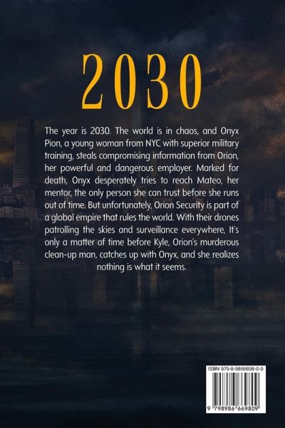 The year is 2030. The world is in chaos, and Onyx Pion, a young woman from NYC with superior military training, steals compromising information from Orion, her powerful and dangerous employer. Marked for death, Onyx desperately tries to reach Mateo, her mentor, the only person she can trust, before she runs out of time. But unfortunately, Orion Security is part of a global empire that rules the world. With their drones patrolling the skies and surveillance everywhere, It's only a matter of time before Kyle, Orion's murderous clean-up man, catches up with Onyx, and she realizes nothing is what it seems.