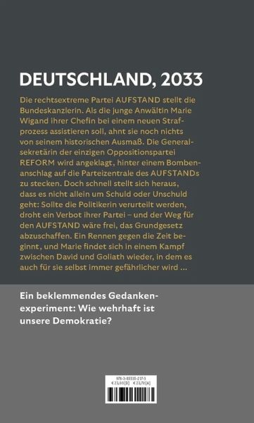 Deutschland, 2033. Die rechtsextreme Partei AUFSTAND stellt die Bundeskanzlerin. Als die junge Anwältin Marie Wigand ihrer Chefin bei einem neuen Strafprozess assistieren soll, ahnt sie noch nichts von seinem historischen Ausmaß. Die Generalsekretärin der einzigen Oppositionspartei REFORM wird angeklagt, hinter einem Bombenanschlag auf die Parteizentrale des AUFSTANDs zu stecken. Doch schnell stellt sich heraus, dass es nicht allein um Schuld oder Unschuld geht: Sollte die Politikerin verurteilt werden, droht ein Verbot ihrer Partei - und der Weg für den AUFSTAND wäre frei, das Grundgesetz abzuschaffen. Ein Rennen gegen die Zeit beginnt, und Marie findet sich in einem Kampf zwischen David und Goliath wieder, in dem es auch für sie selbst immer gefährlicher wird ...